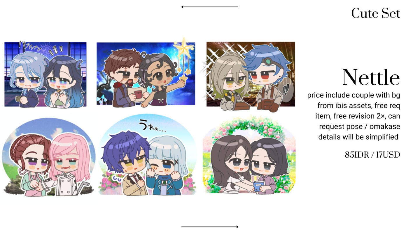 | Cimol | Single or (Couple) with bg | 50IDR / 100IDR | 10USD / 18USD | Payment first, free 2x minor revision, can request background |